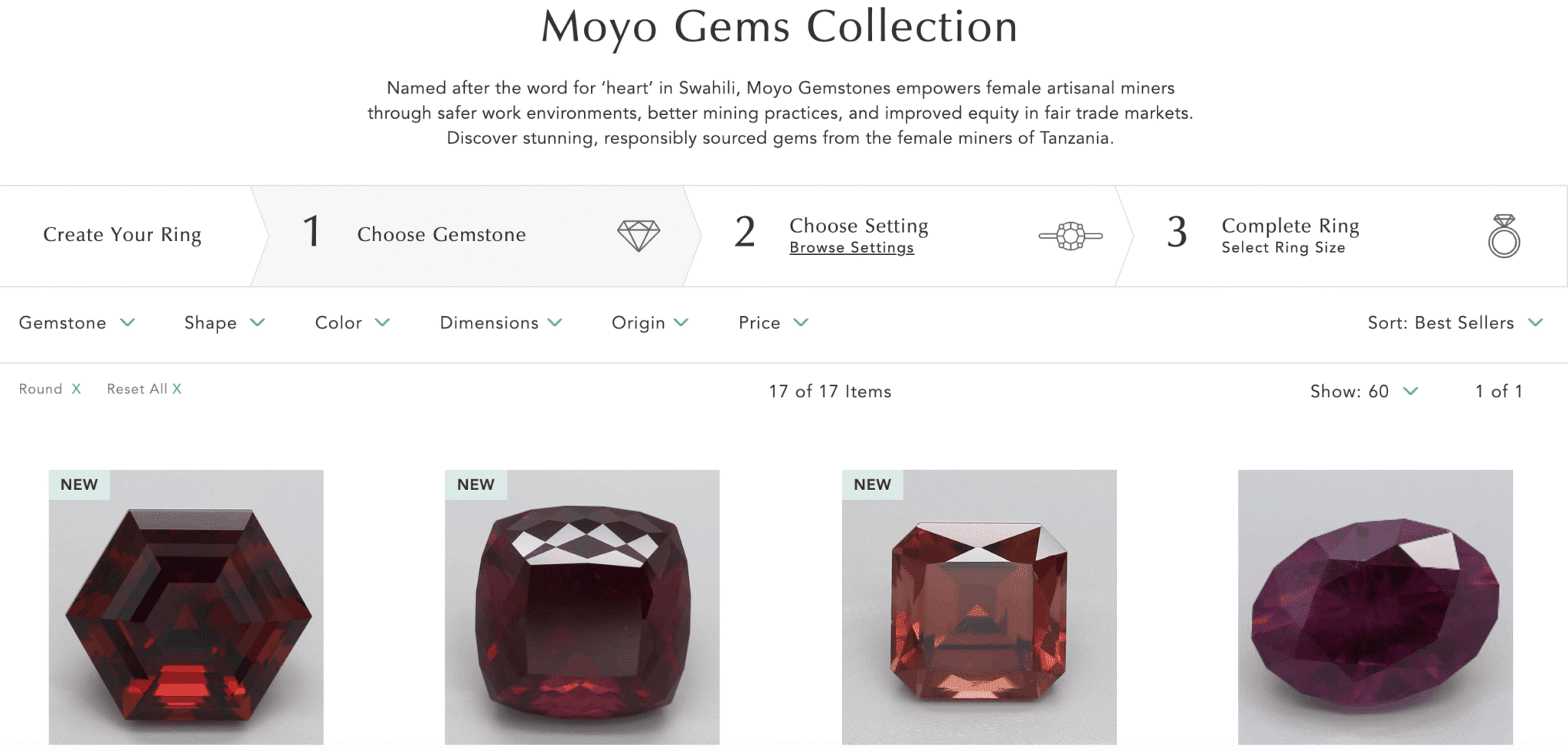 Moyo Gemstones are a collection of colored gemstones that Brilliant Earth carries. It’s a fairly small collection with under 20 options. Currently, the options are garnets, zircon, spinel, and tourmaline.