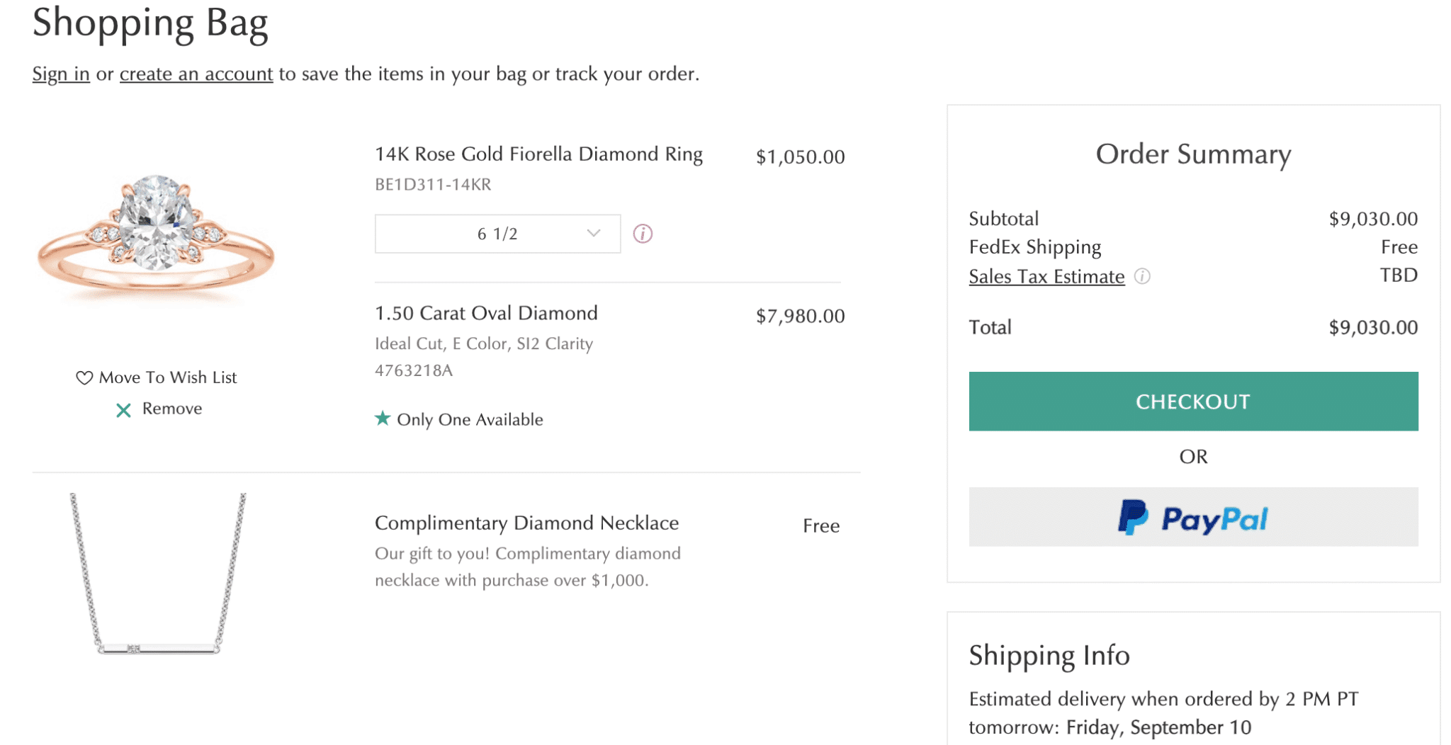 At this point I’ve selected my diamond and ring setting, for a total of $9,030 before tax. At this point in time (and several times throughout the year), Brilliant Earth offers a free diamond necklace with purchases over $1,000.
