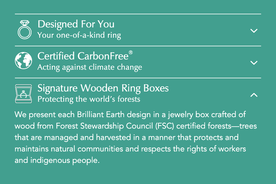 No diamond company is truly green, even if they’re lab created diamonds. Lab grown diamonds aren’t necessarily better for the environment. Brilliant Earth tries to do more by also providing packing materials suited for the environment, including a wooden jewelry box.