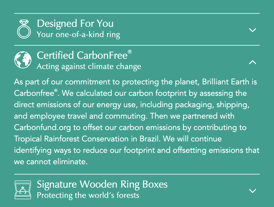 Brilliant Earth is most focused on conflict-free gemstones, giving back to the community, and providing transparency to customers concerned about diamond and gemstone ethical practices.