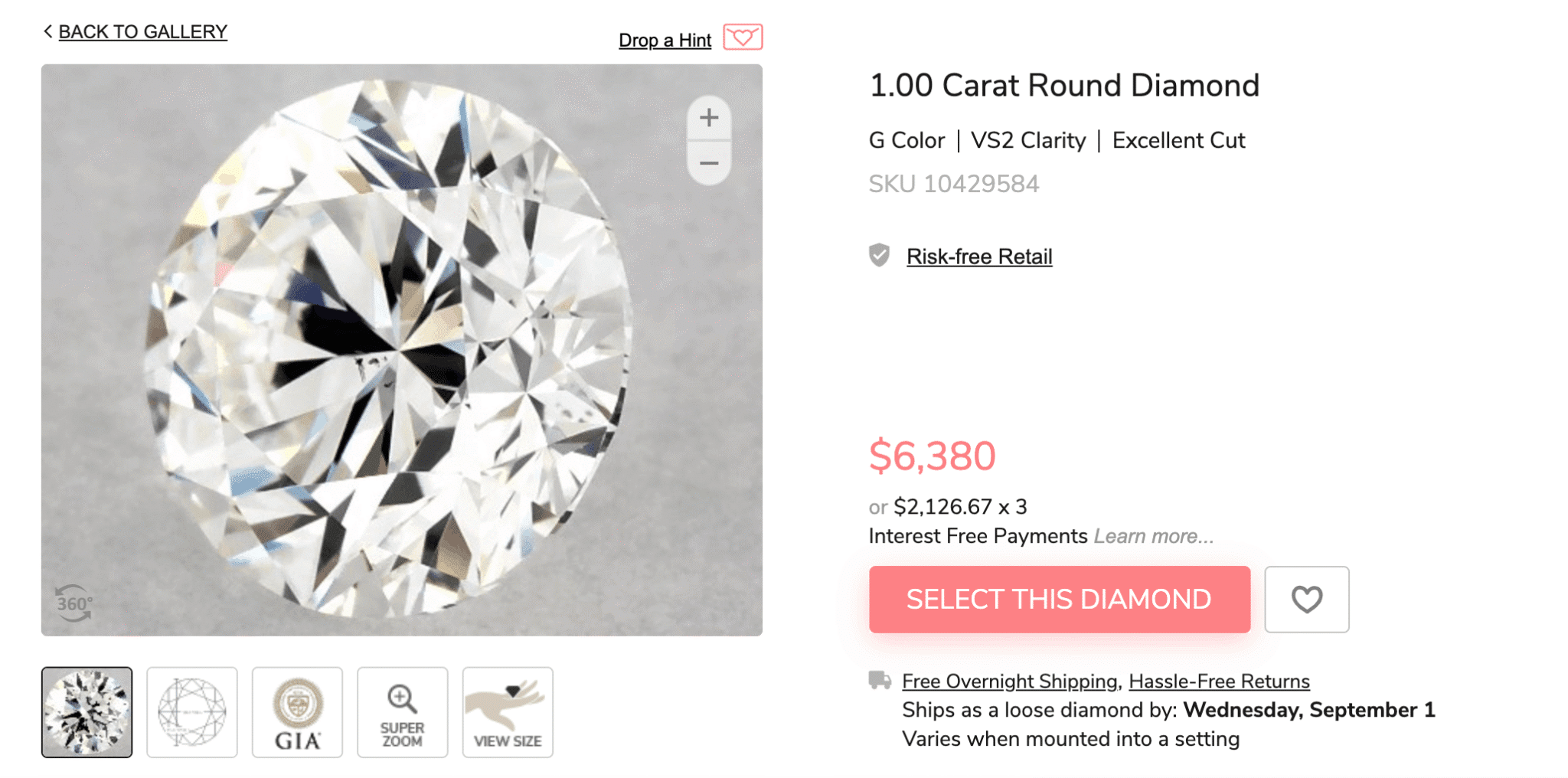 I’ve chosen an ideal round cut 1 carat blockchain diamond from Brilliant Earth. It has a clarity grade of VS2 and a color grade of G. It also comes with a GIA Origin Report. The price of this diamond is $7580.