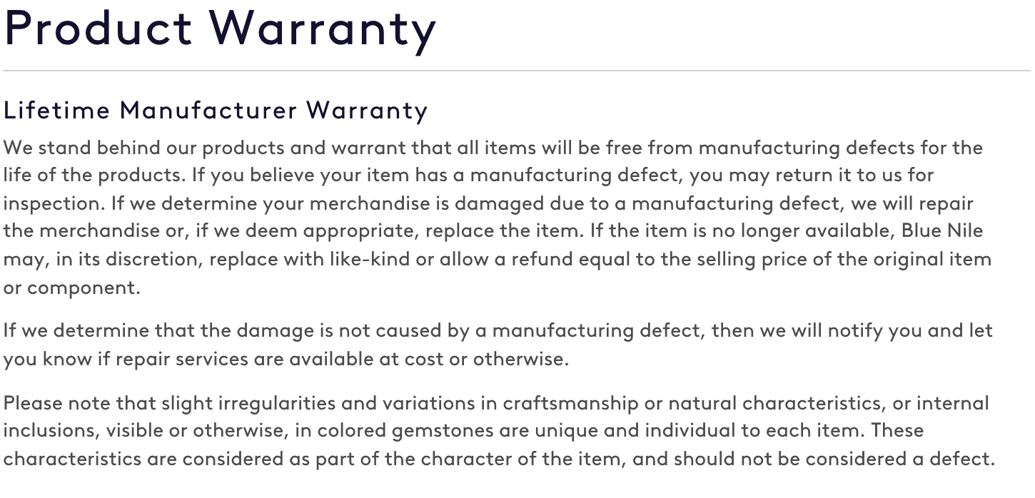 It won’t take long to talk about Blue Nile’s repair warranty, because they don’t have one. They give you a lifetime manufacturer’s warranty. Manufacturing defects are like when the same stone keeps falling out over and over again, or the shank itself keeps breaking.