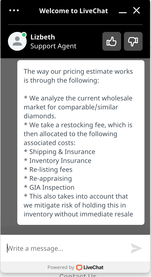 I also asked about selling your diamond. Initially, she didn’t really give me much to go off of, but she quickly corrected herself and apologized, then gave me more of what I was looking for, with all the rundown of that price.