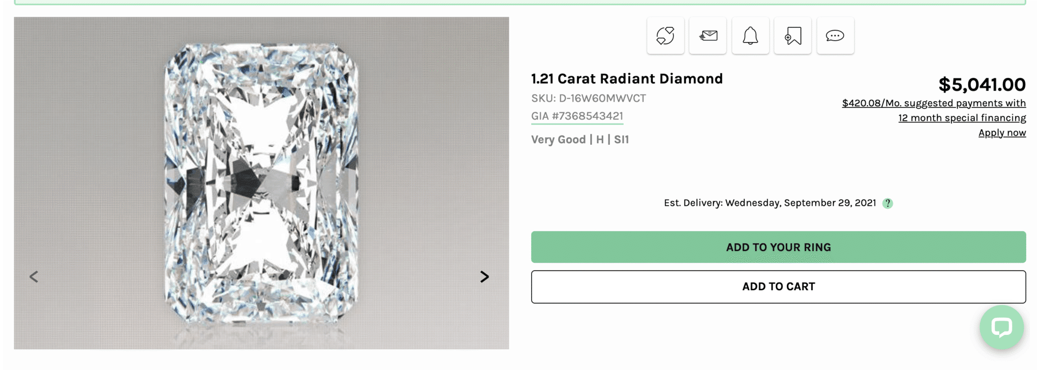 I’m choosing a 1.21 carat natural radiant cut diamond from Ritani’s catalogue of over 80,000 loose diamonds. They also carry fancy yellow diamonds and lab grown diamonds, if you want either of those.