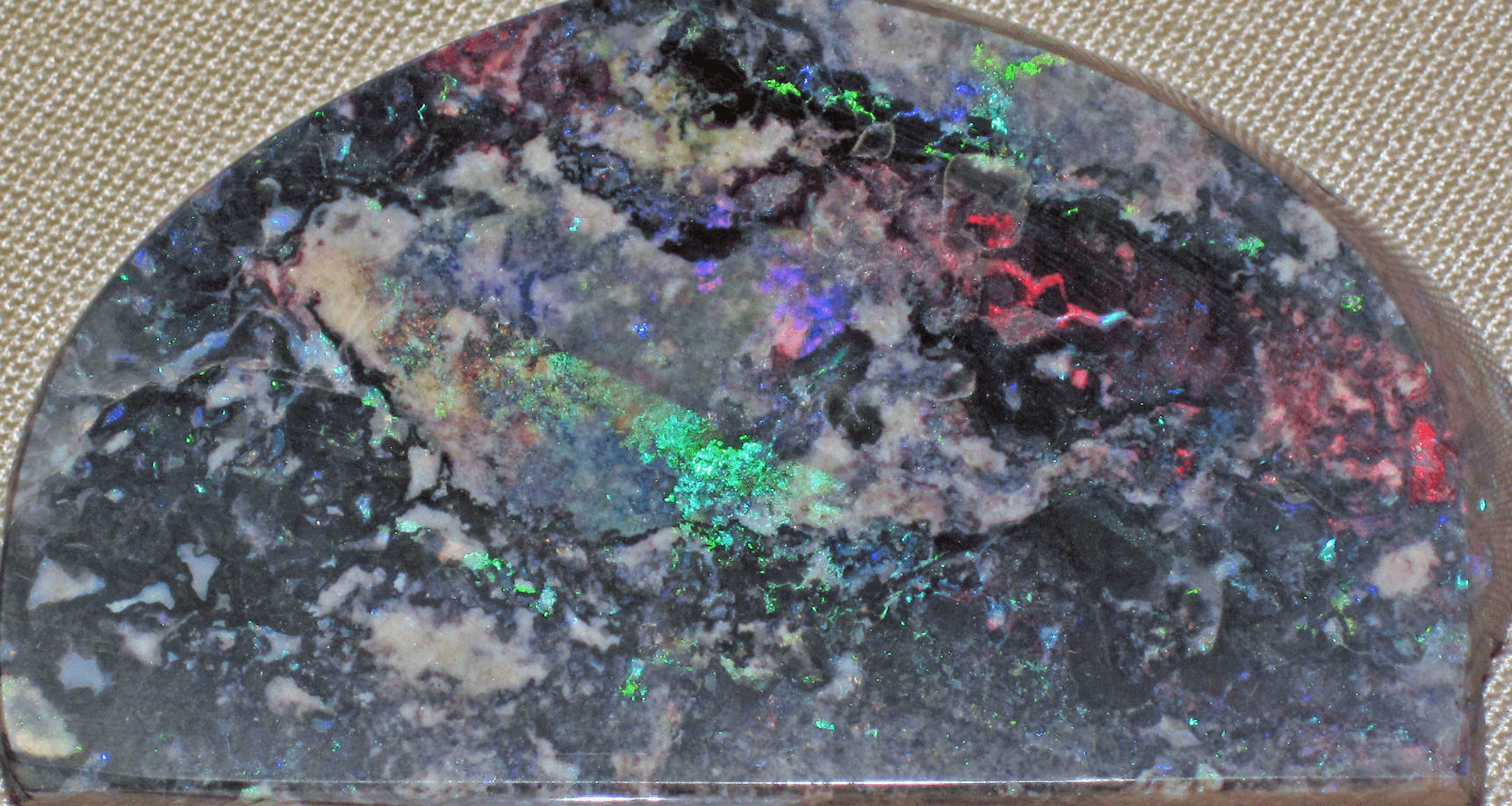 Play of color is what’s seen in precious opal. The bright flashes of red, green, yellow and other colors is most desirable in opals and is the number one factor in opal quality.