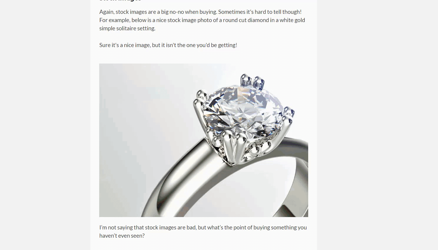 Again, stock images are a big no-no when buying. Sometimes it’s hard to tell though! For example, below is a nice stock image photo of a round cut diamond in a white gold simple solitaire setting.