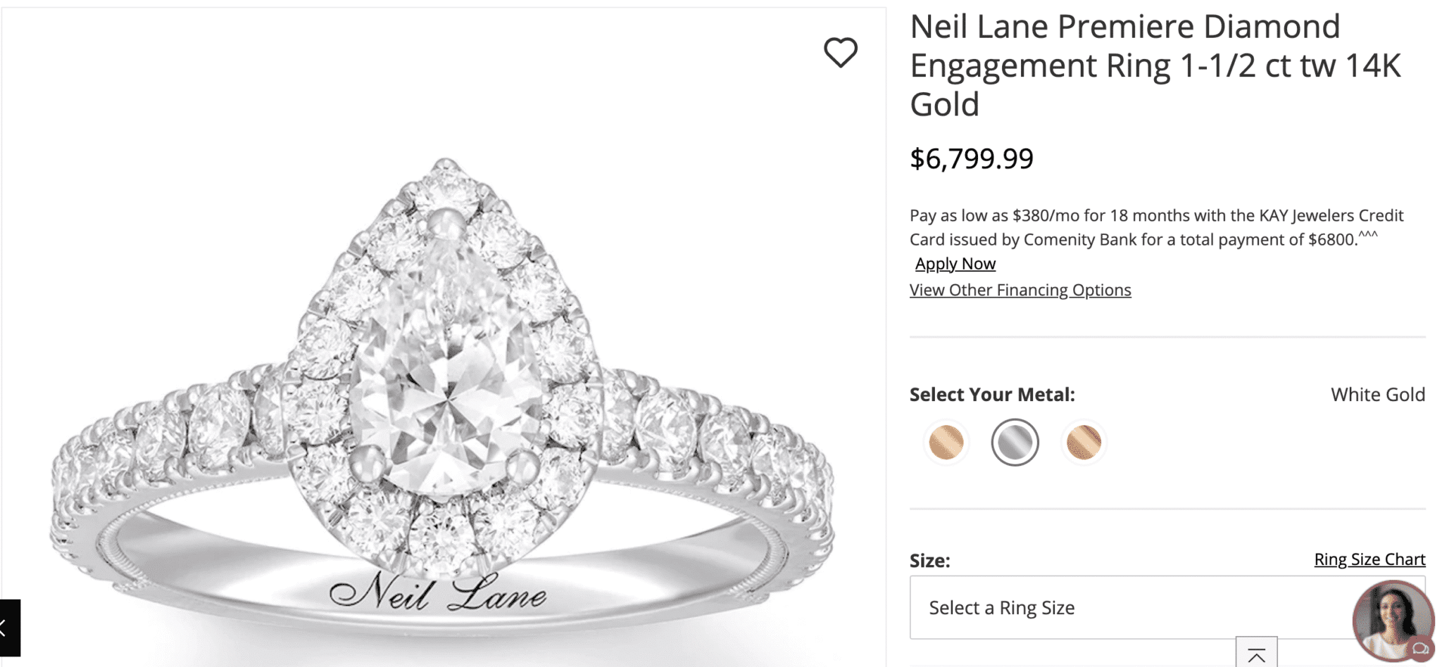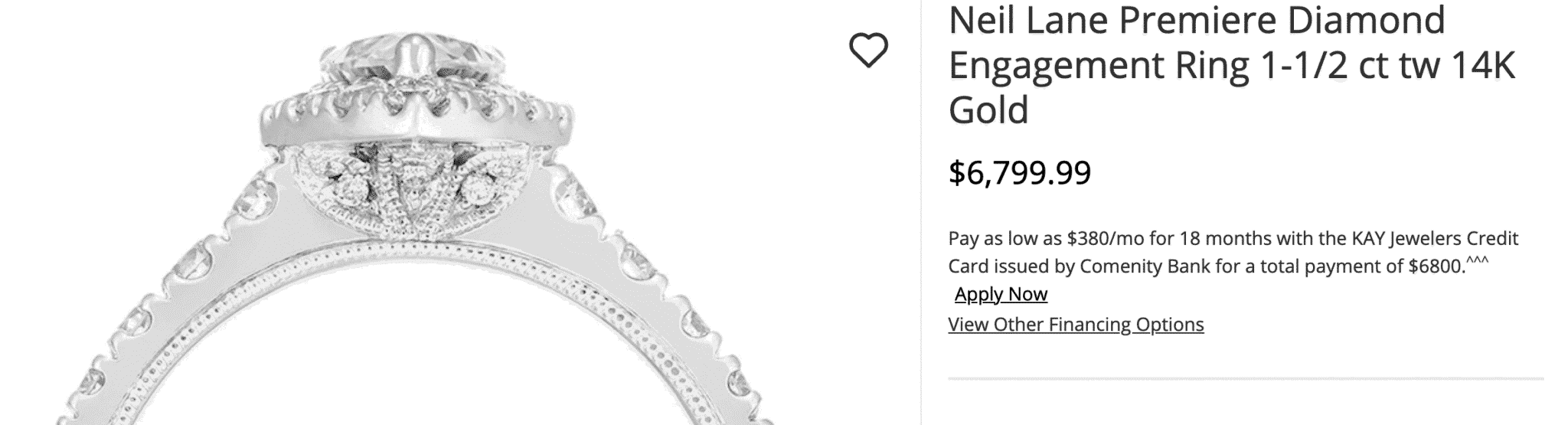 The diamond already comes set in this Neil Lane ring and is 3/4 carat with SI2 clarity and I color. It’s $6,800. You don’t even get to pick out the center diamond.