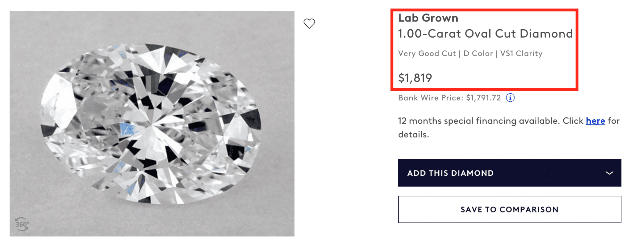 VS1 Lab Grown Diamond, Oval, 1 Carat, D Color $1819 from Blue Nile at time of posting