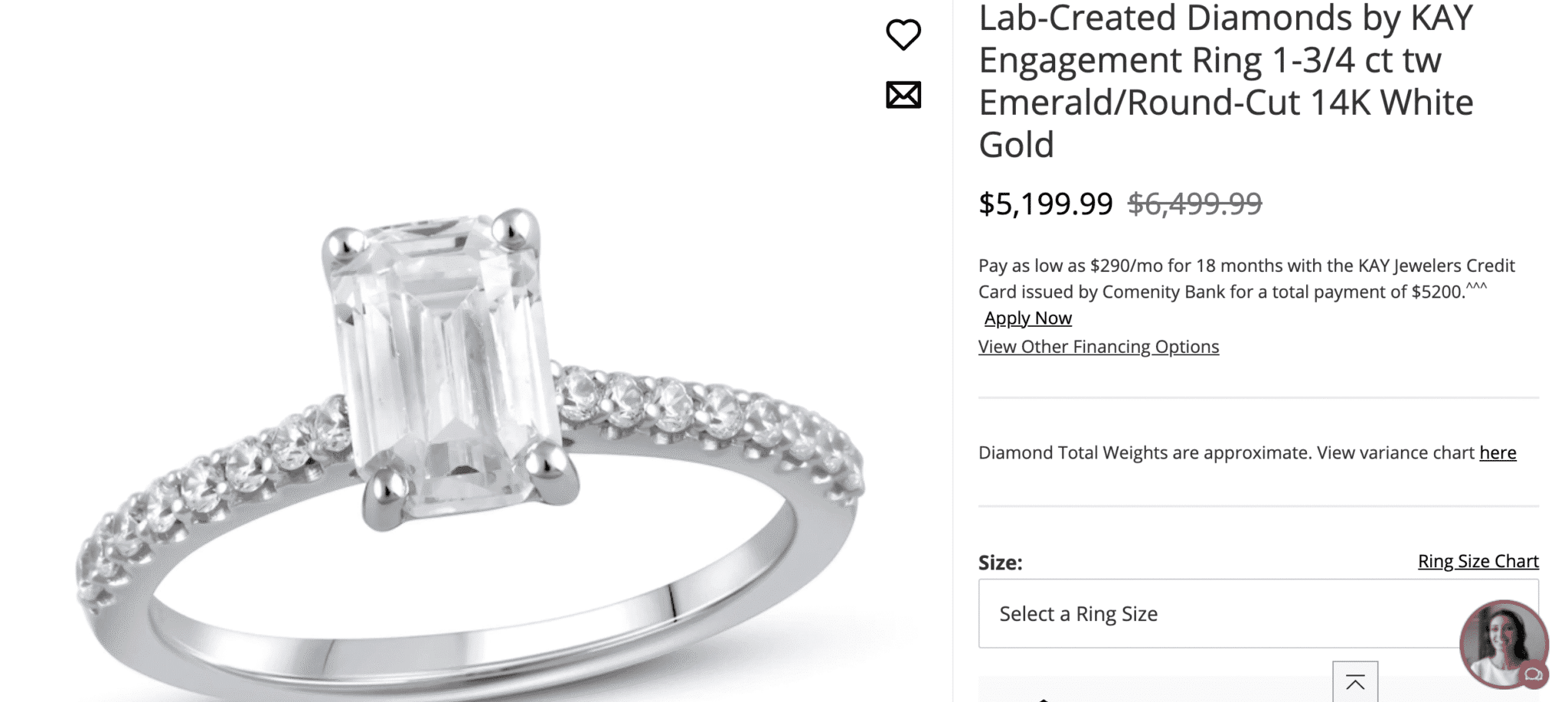 Here’s a 1.5 carat emerald cut lab grown diamond engagement ring from big name retailer, Kay Jewelers. The total weight of the ring is 1 3/4 approximately. The clarity is SI2 and the color grade is F. It comes with an independent certification, unnamed.