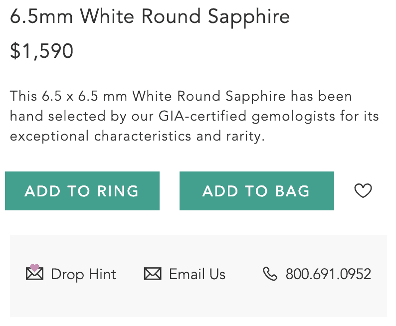 The white sapphire above is a natural white sapphire from Brilliant Earth. These are more expensive, but still far from our lab diamond.