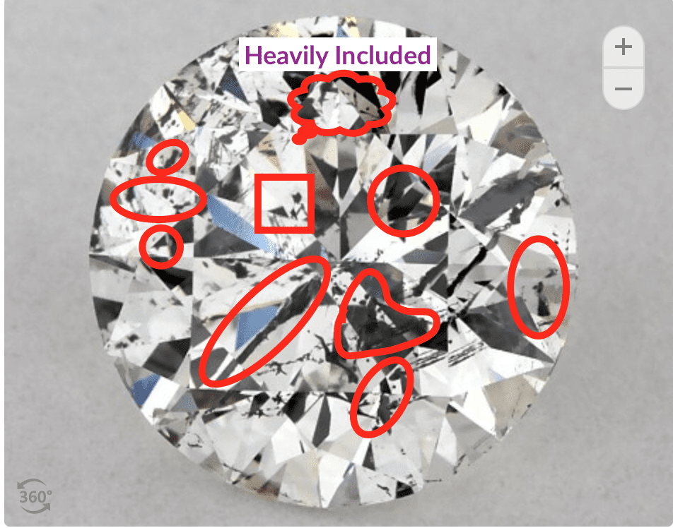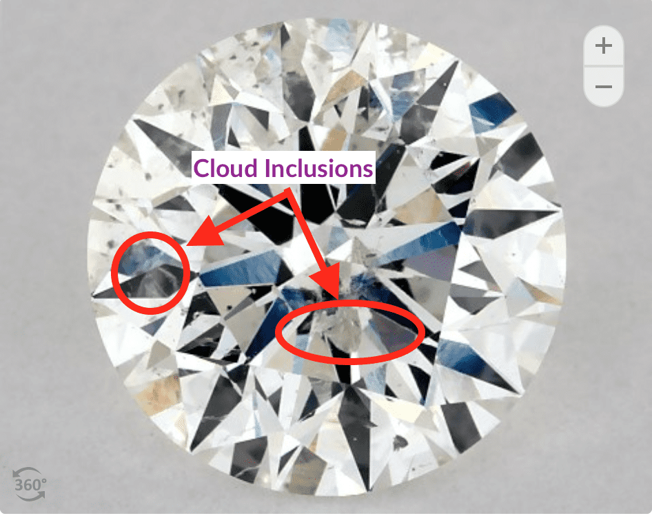 Say you bought an 1.5 carat diamond with I1 clarity and J Color grade. It could have white cloud inclusions like the diamond below.