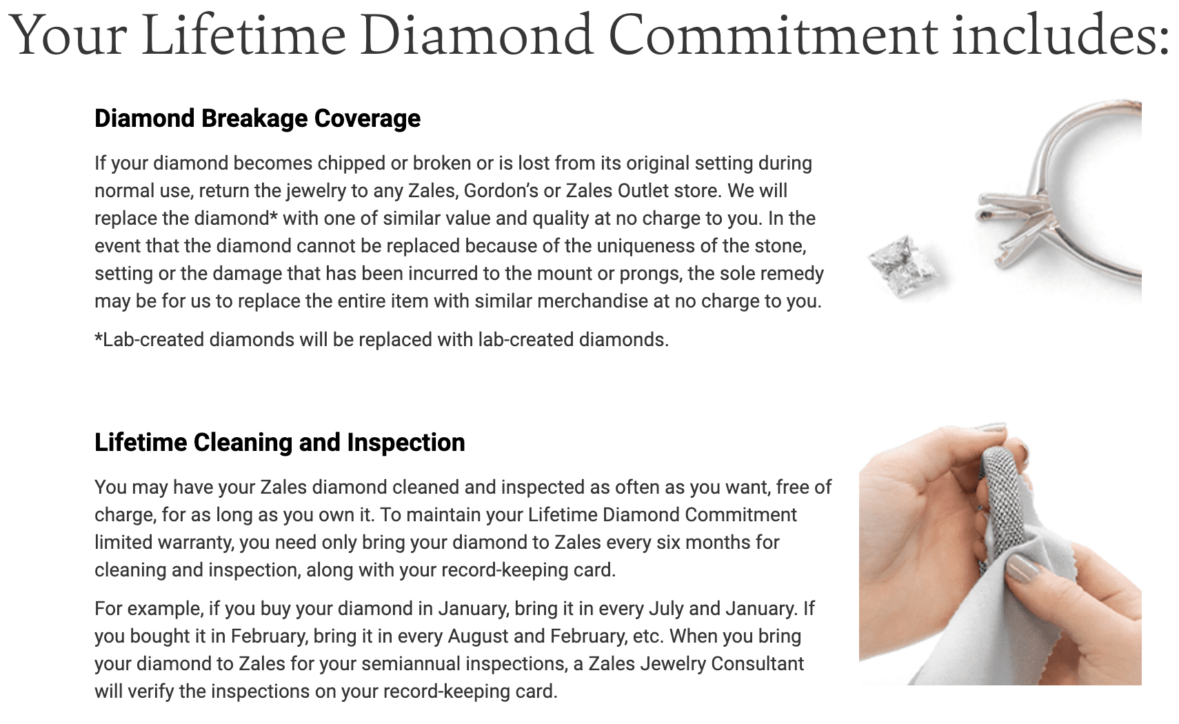 At Zales, they give a free warranty called the Lifetime Diamond Commitment. It states that as long as you come into a Zales location to have your engagement ring cleaned, inspected, and recorded, they’ll replace your diamond if it’s damaged or missing. The diamond will be the same grade or better than the one it’s replacing.