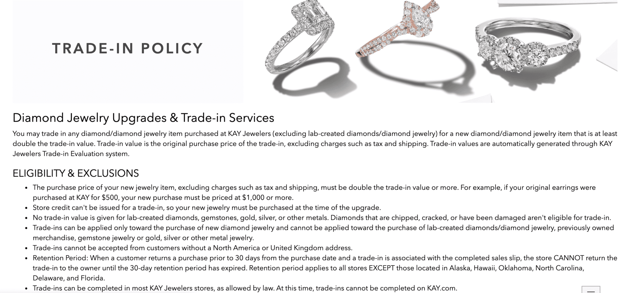 They both offer diamond upgrade policies to spend at least double the original piece of diamond jewelry you’re trading in. It can be diamond rings, necklaces, bracelets, or earrings purchased at their respective stores. The policy is diamonds for diamonds. You must do this in-store.