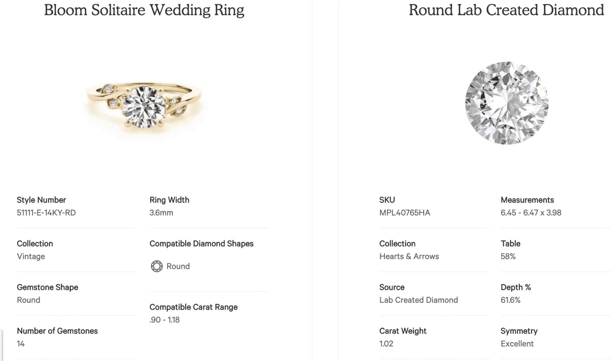 Once I’ve selected my ring setting, I’m taken to one final page before I’m officially adding the solitaire engagement ring I’ve created with my lab diamond and the Bloom Solitaire setting. It allows me to see the specs of both the diamond and ring setting. I can give them both the final once-over. Everything looks great, so let’s find a setting!
