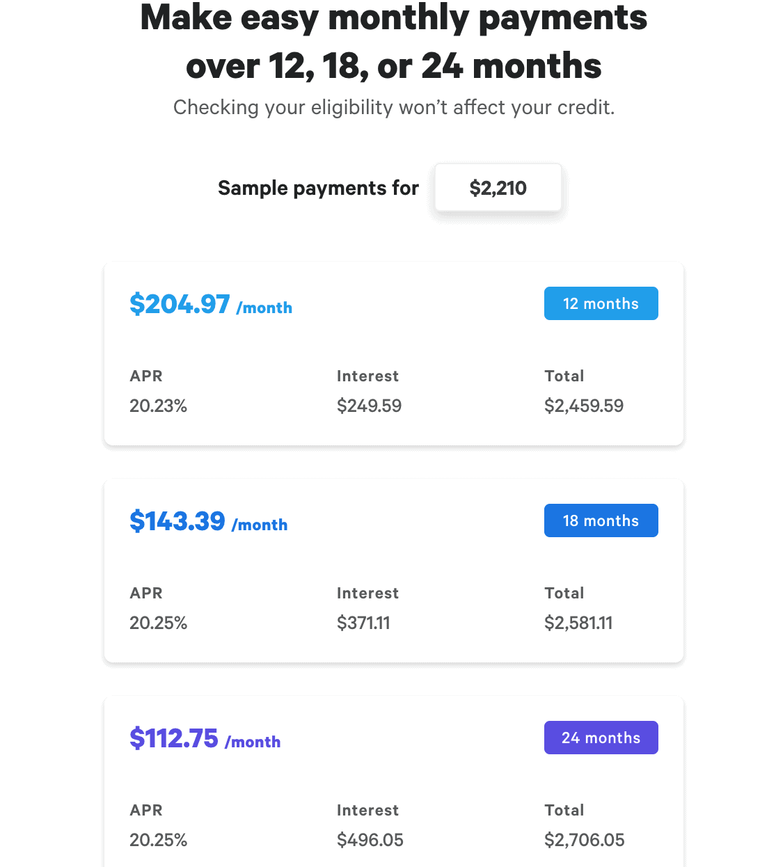 Through Affirm, you can either pay off your purchase within 3 months with no interest, or do the 12, 18, or 24 month plan with 20% APR. Most people pay off within the three months.