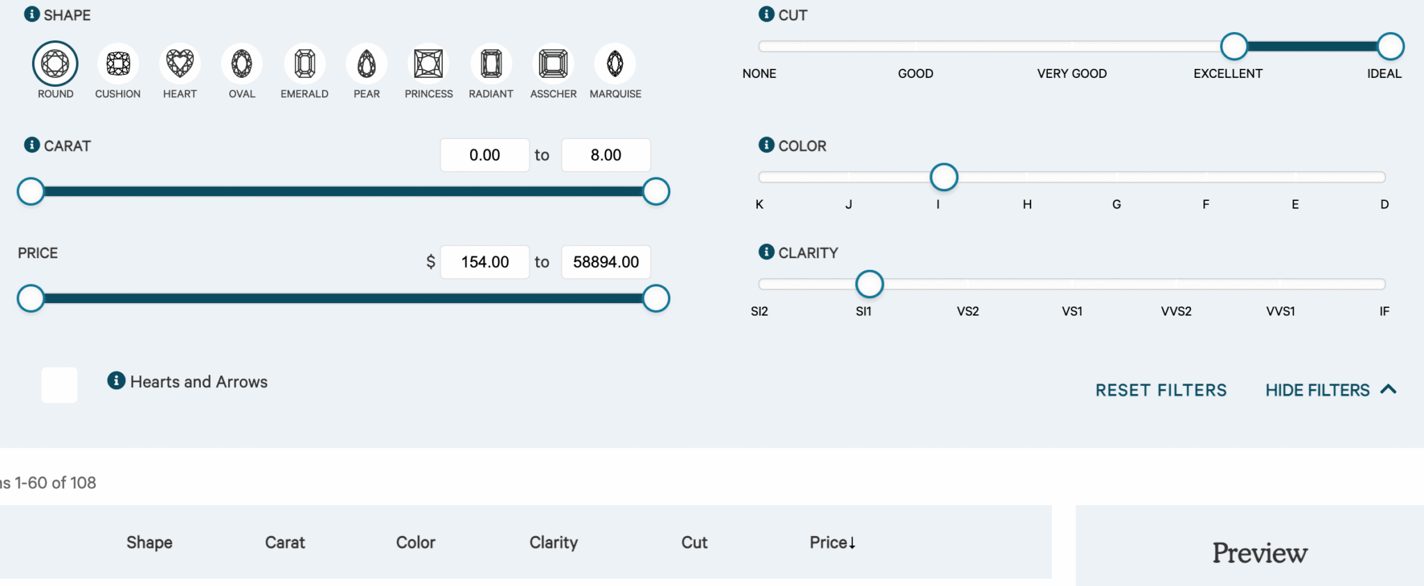 Clean Origin has just over 2600 different lab diamonds of varying diamond quality for me to choose from. The sliders make it easy to pick and choose my diamond shape, color and clarity grades. They even have a little box that you can check if you’re looking for hearts and arrow diamonds.