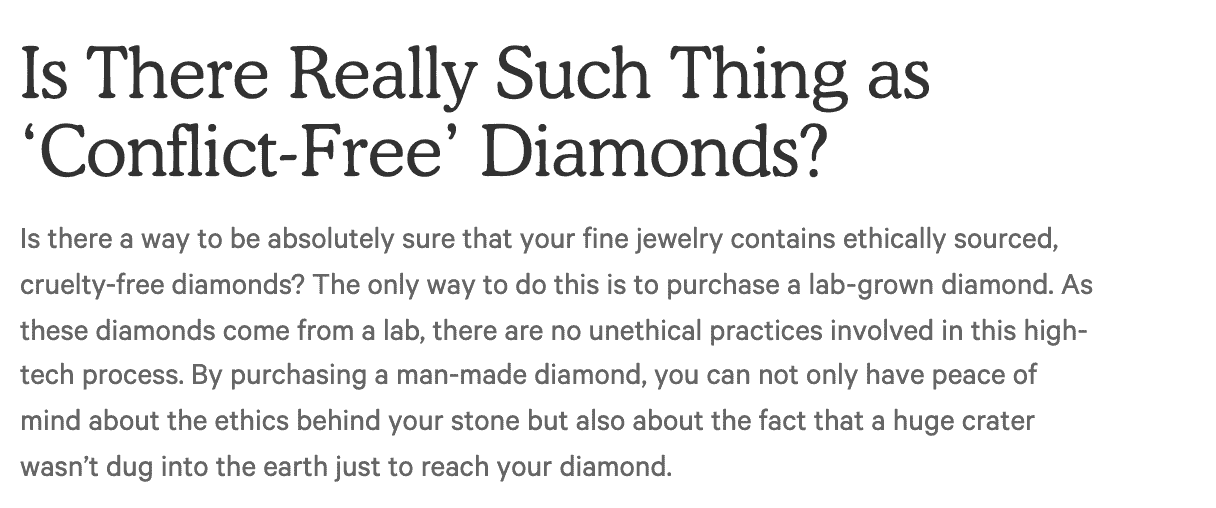 Because of how easy it is for scientists to produce man made diamonds, there’s no mining necessary. That’s how all lab diamonds are considered conflict-free.