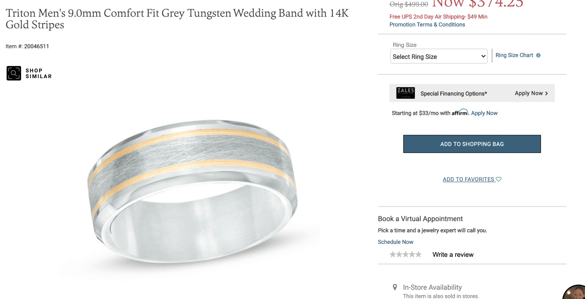You’ll also notice that Zales carries a lot of Triton bands which we know are more expensive as a brand. Thankfully, they do sales all the time that can score you $$ of their rings. Somr Zales tungsten bands come with personalization on it, but be aware that once you personalize something, it’s non-returnable.